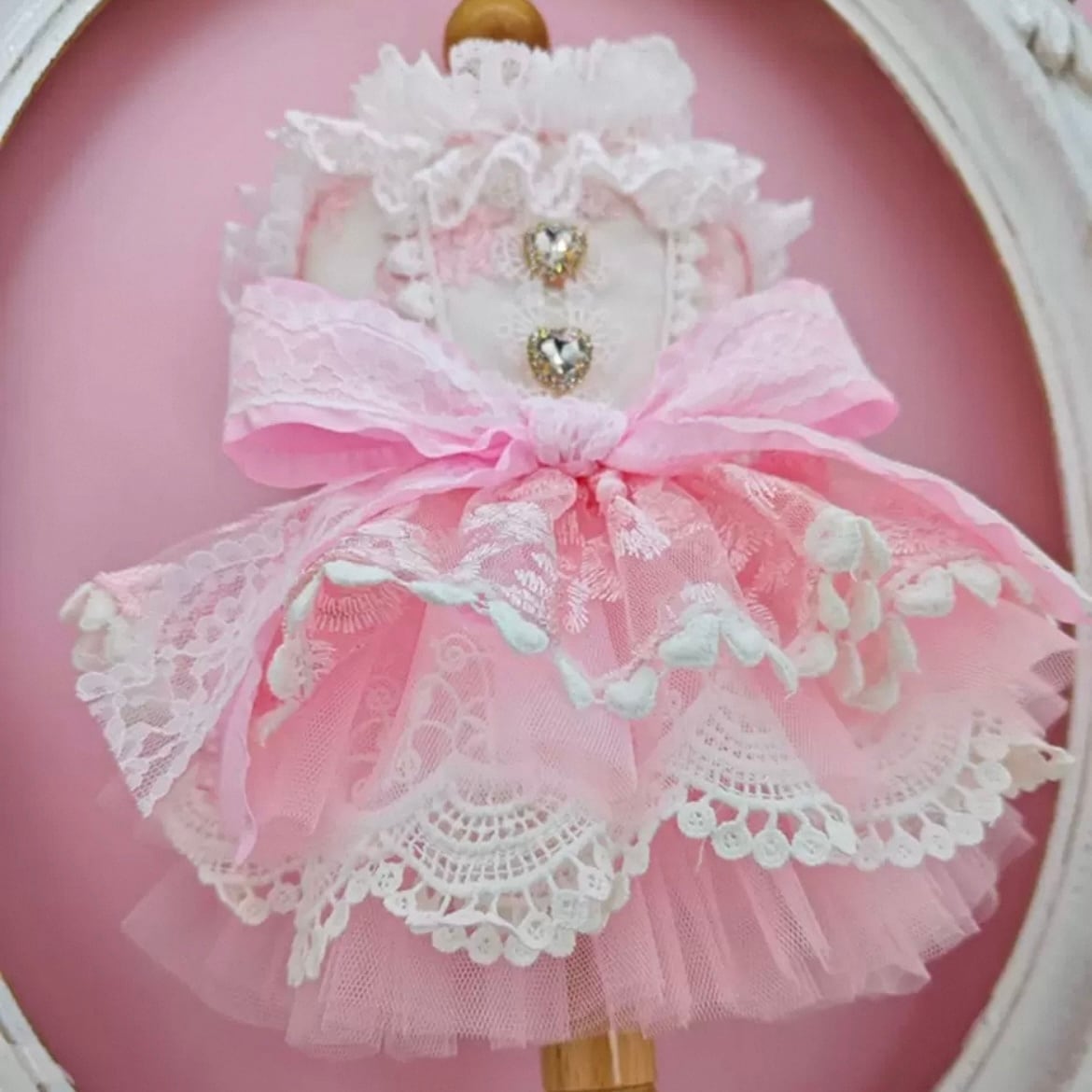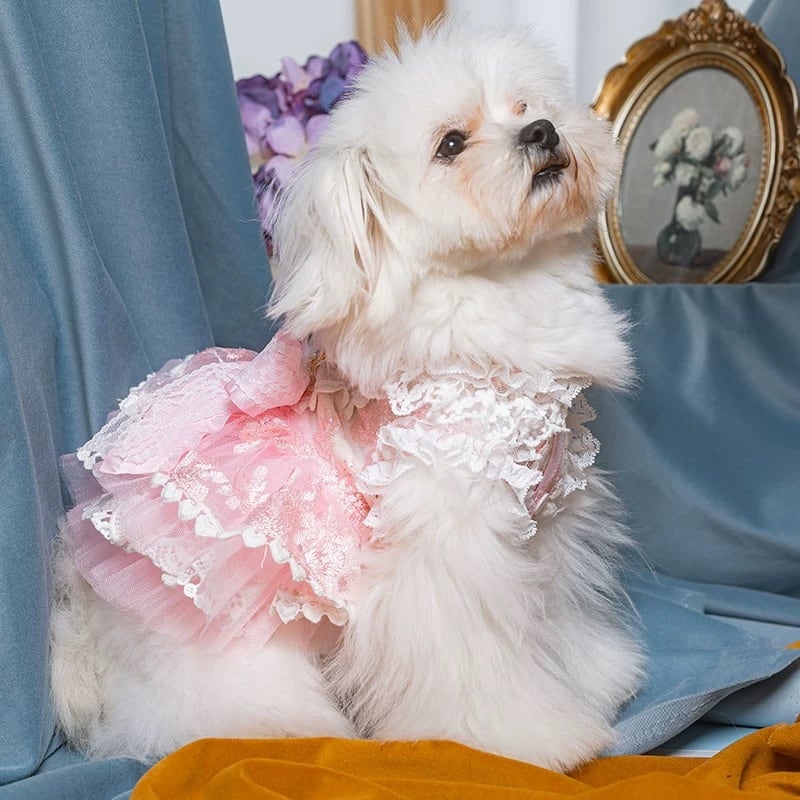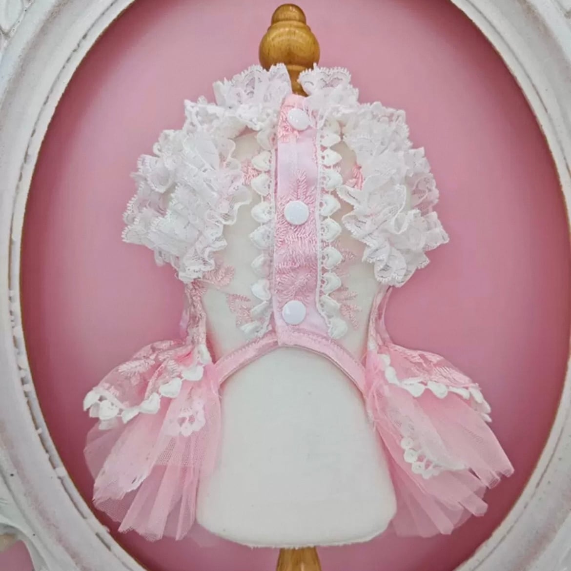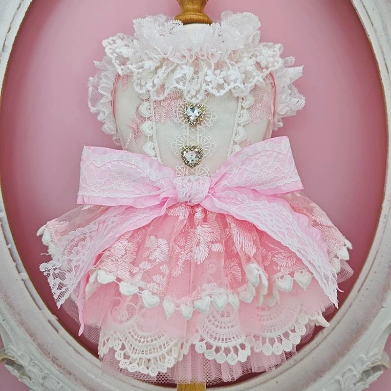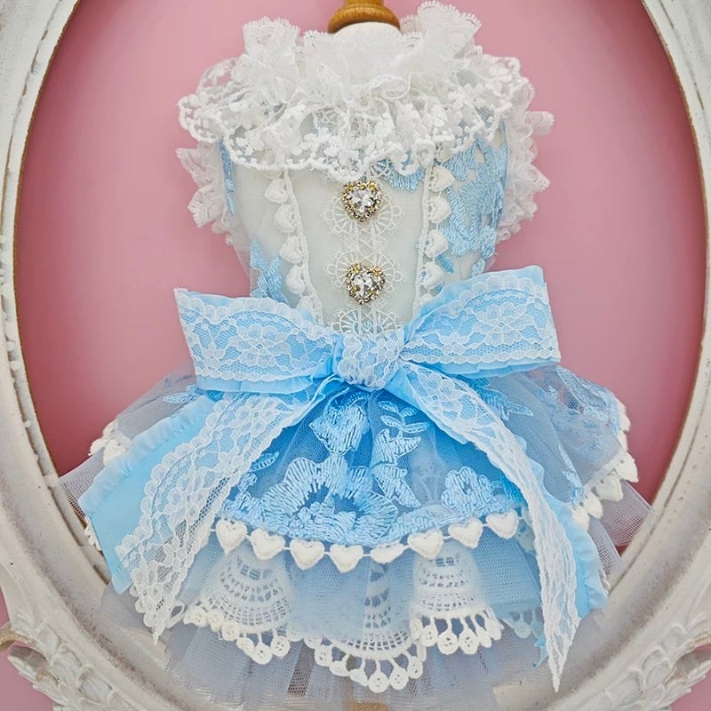 首元に施された繊細なフリルと、レイヤードされたチュールレースが織りなす、ロマンティックなドレスです。