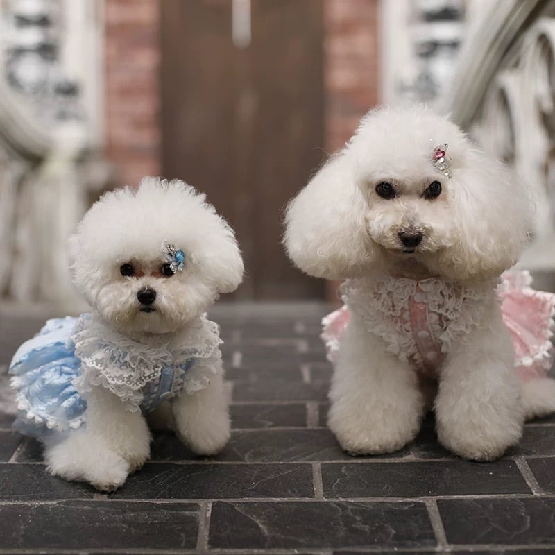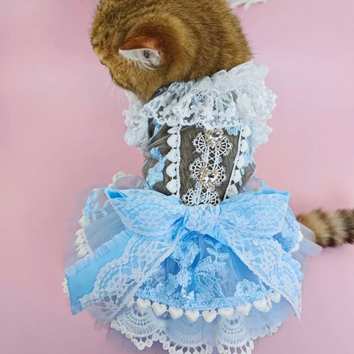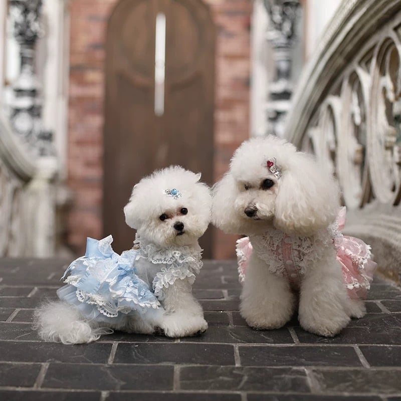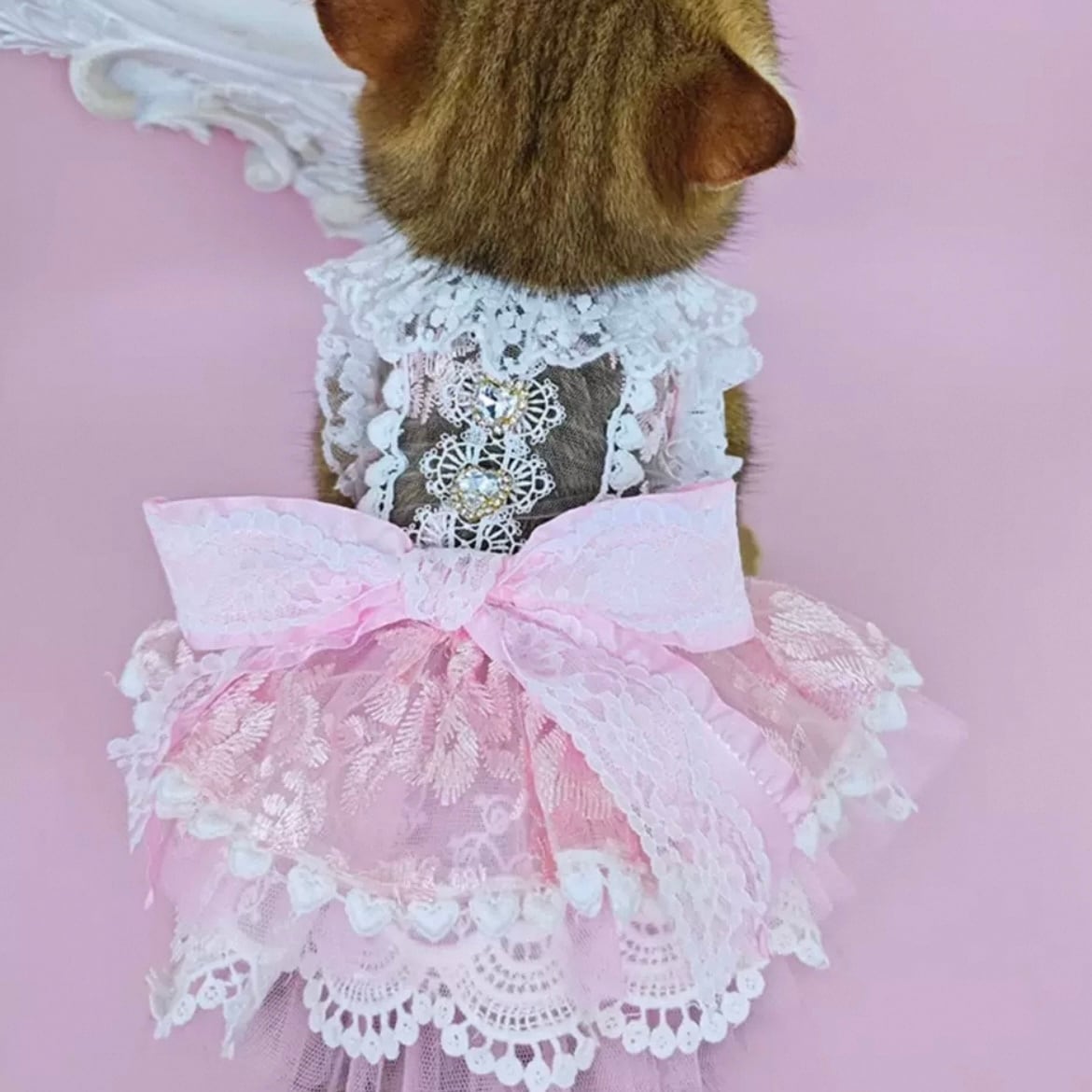 首元に施された繊細なフリルと、レイヤードされたチュールレースが織りなす、ロマンティックなドレスです。