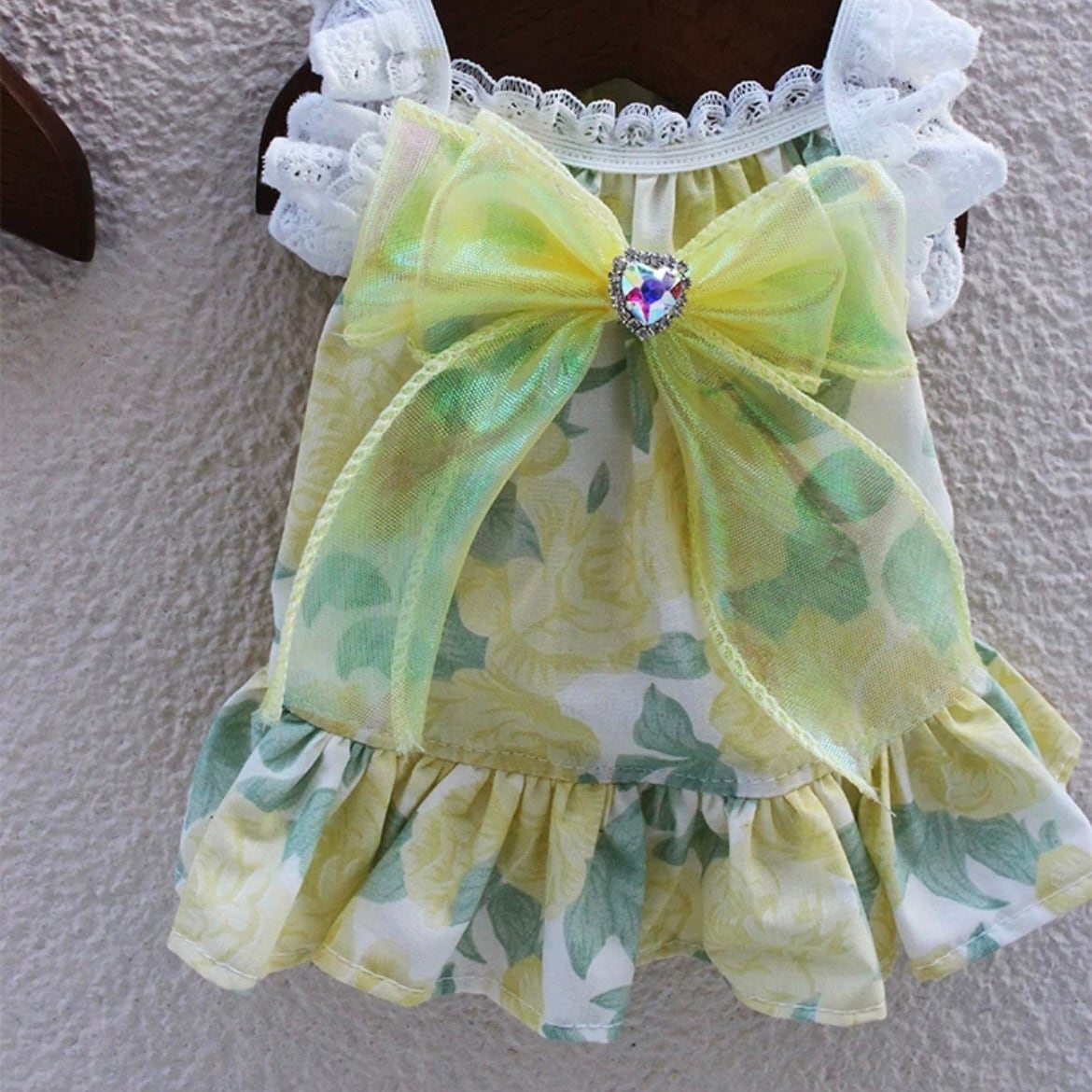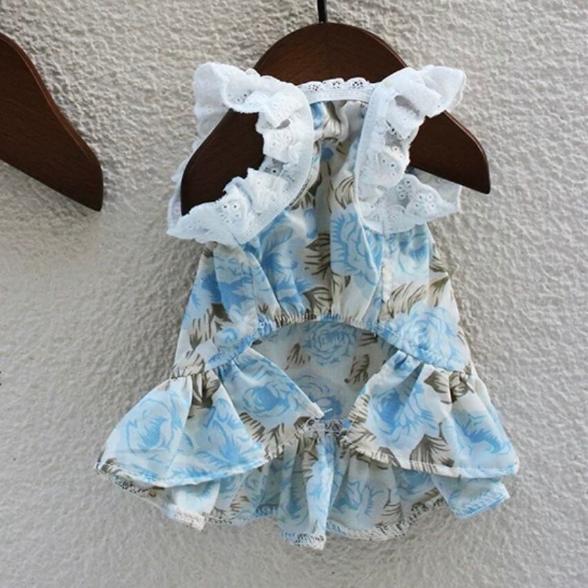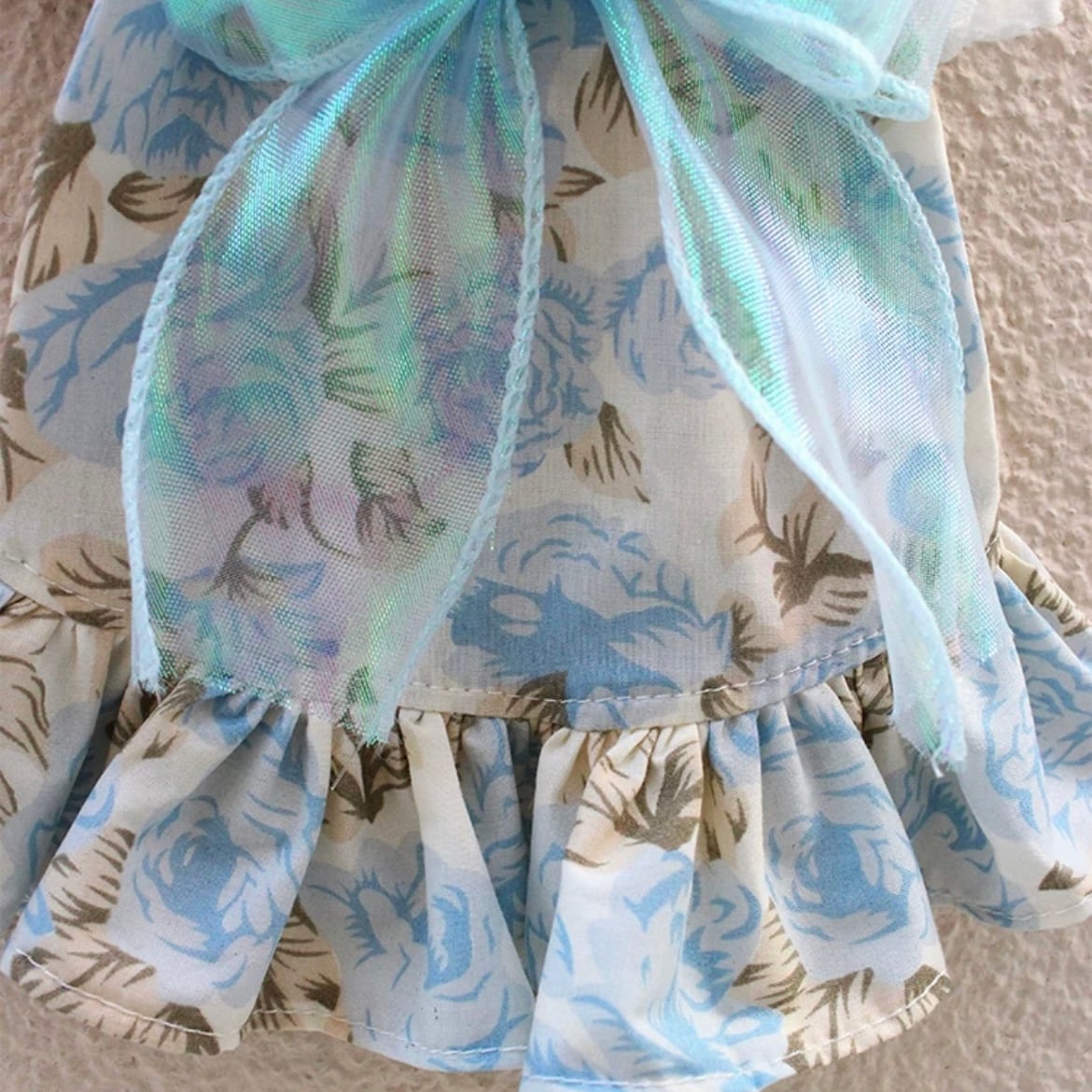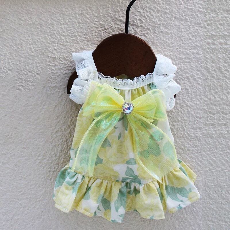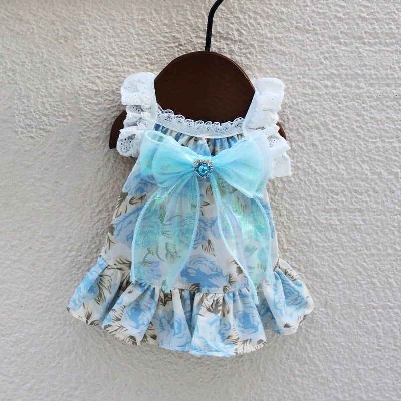 上品な花柄とフレアスリーブが特徴のAラインワンピース。大きなリボンがワンポイントとなり、華やかさをプラスします。特別な日のお洋服としてだけでなく、普段使いにもぴったりです。ワンちゃんを美しく着飾りたい飼い主さまにおすすめです。