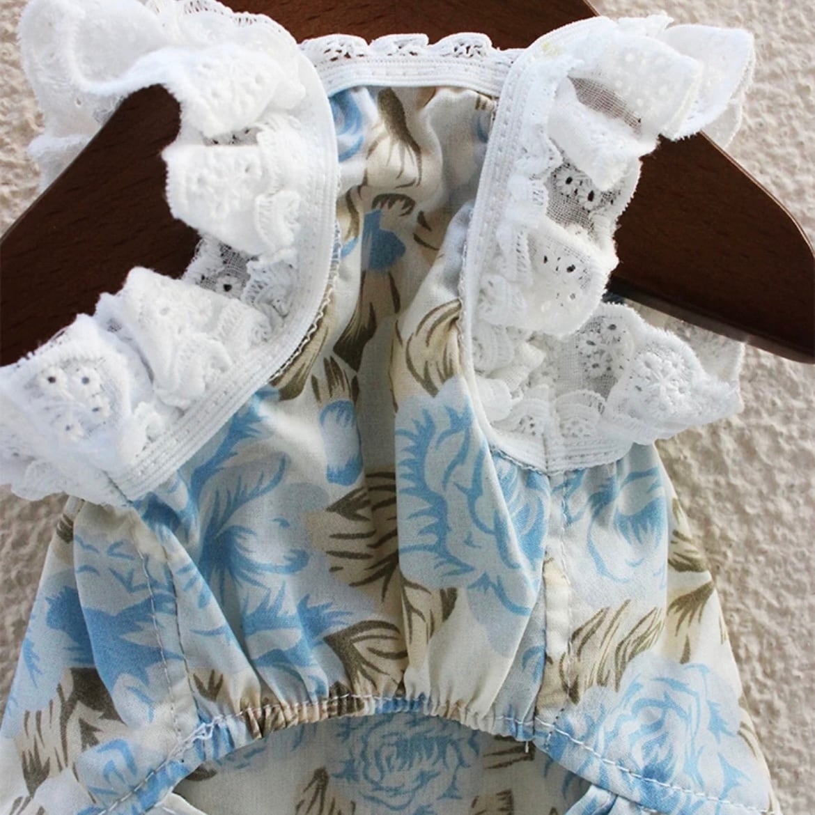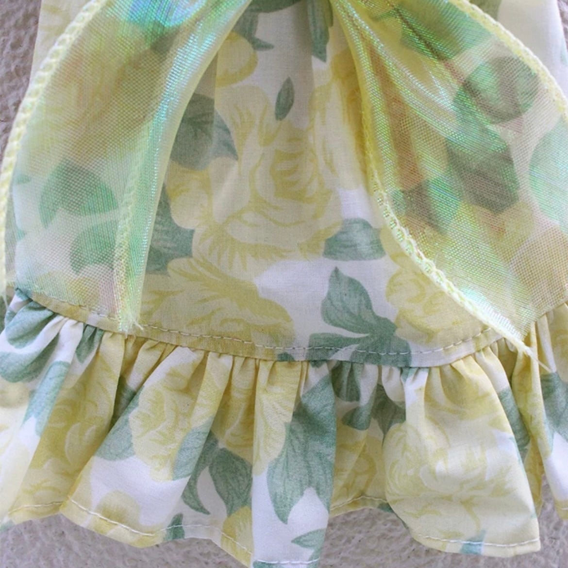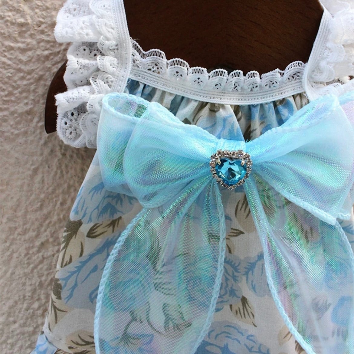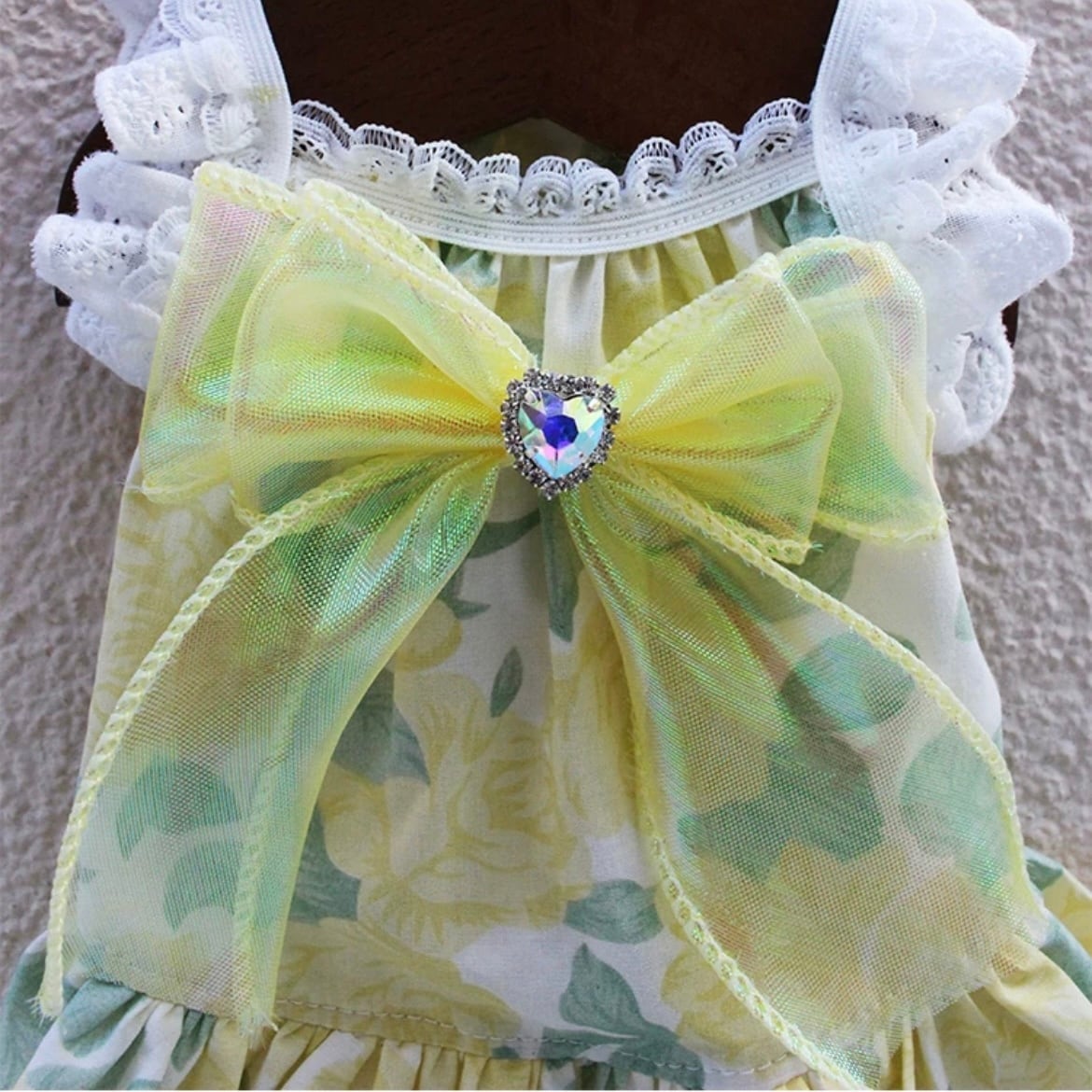 上品な花柄とフレアスリーブが特徴のAラインワンピース。大きなリボンがワンポイントとなり、華やかさをプラスします。特別な日のお洋服としてだけでなく、普段使いにもぴったりです。ワンちゃんを美しく着飾りたい飼い主さまにおすすめです。