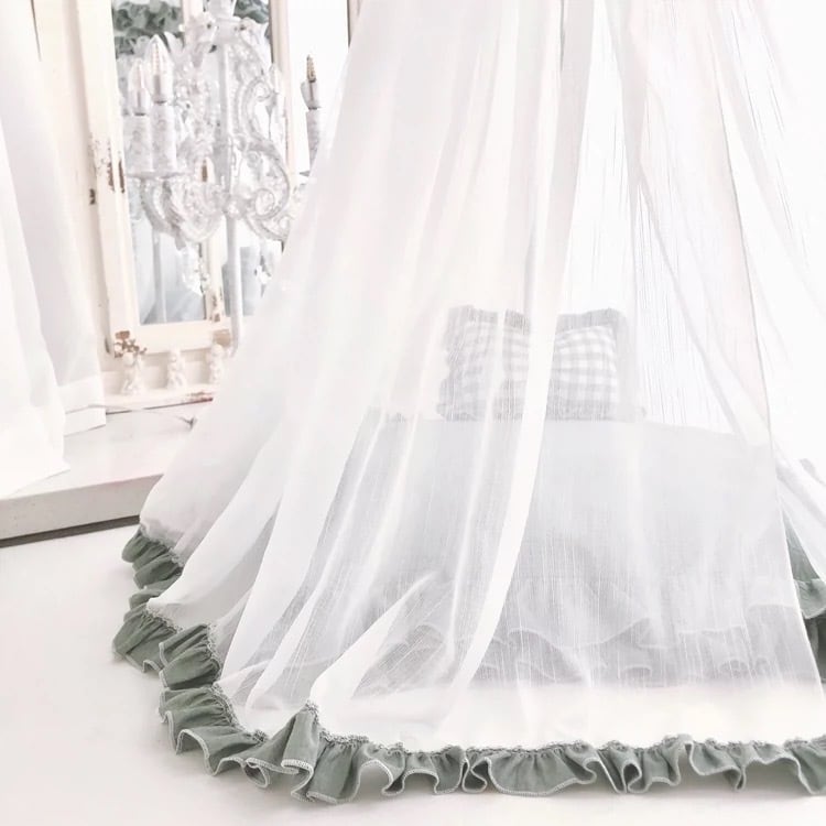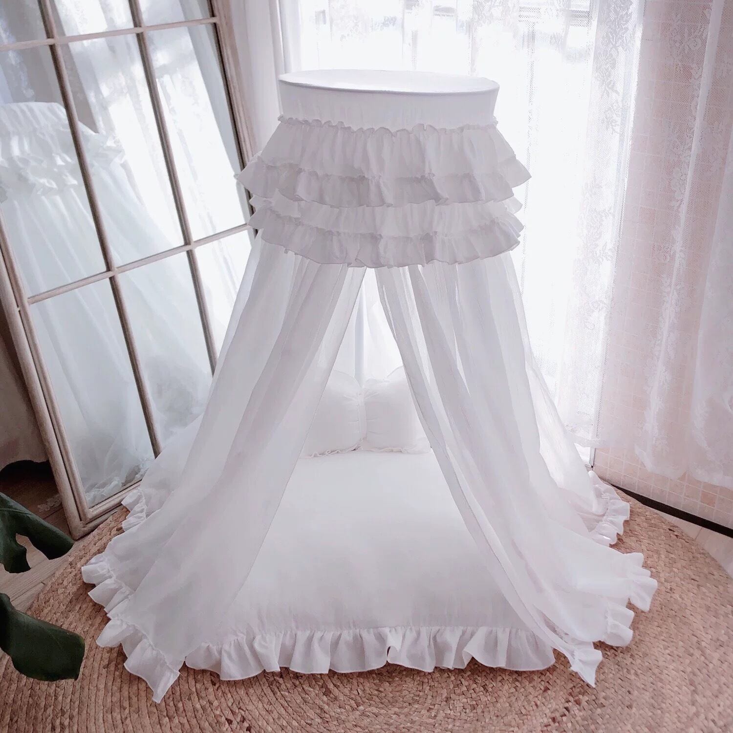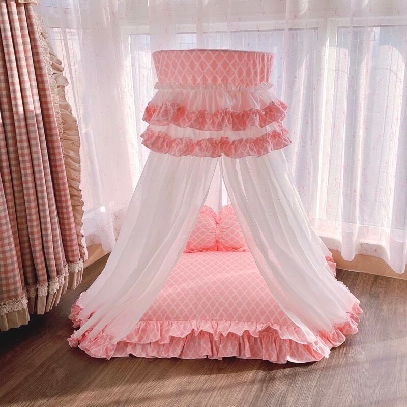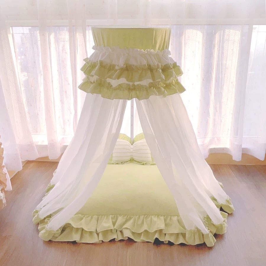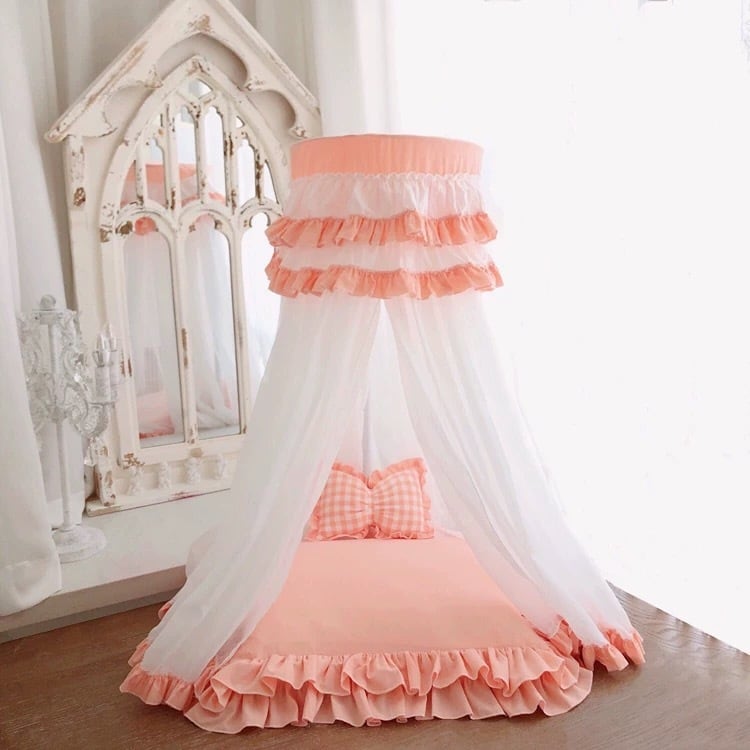 幾重にも重なったシアー素材のティアードフリルが、ロマンティックな空間を演出する天蓋付きのベッドです。