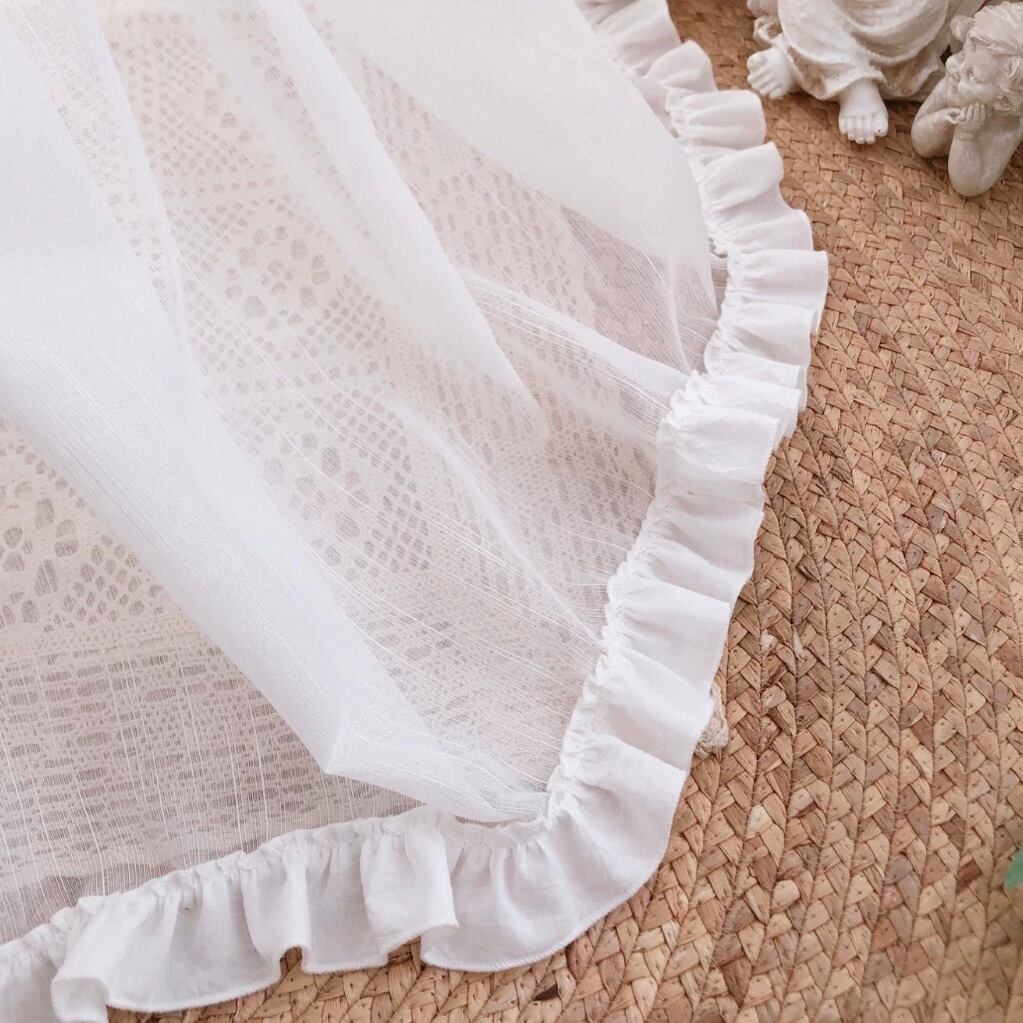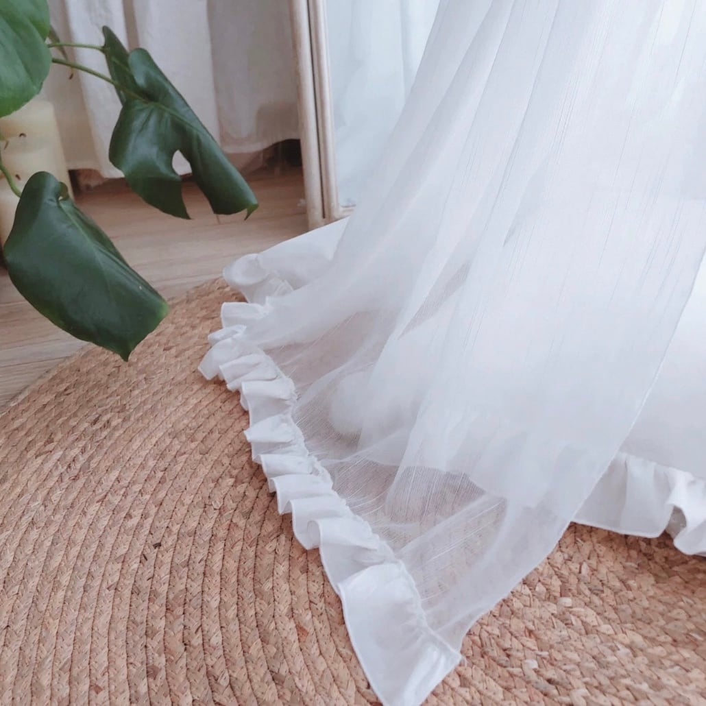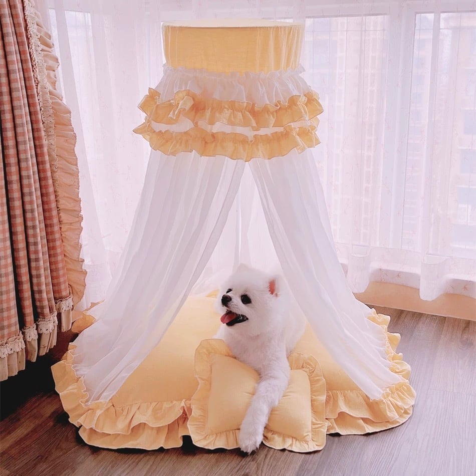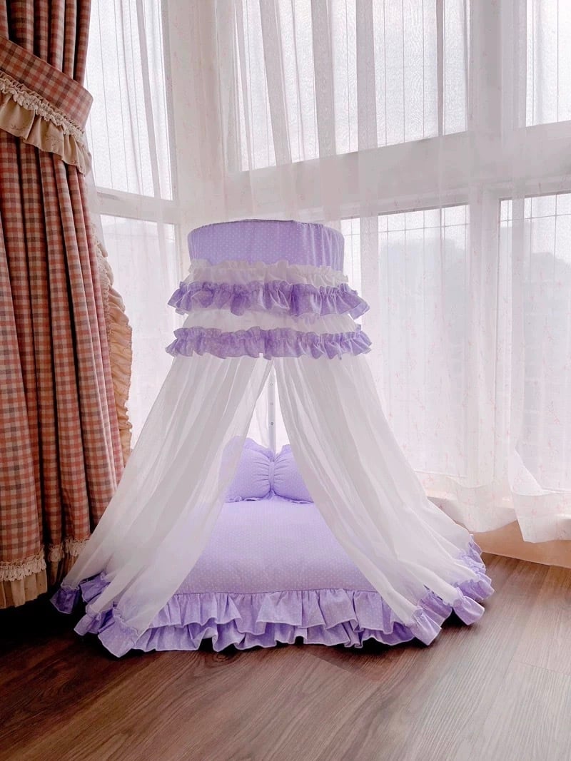 幾重にも重なったシアー素材のティアードフリルが、ロマンティックな空間を演出する天蓋付きのベッドです。
