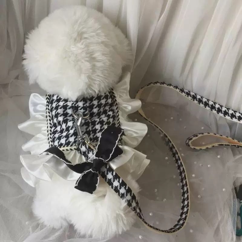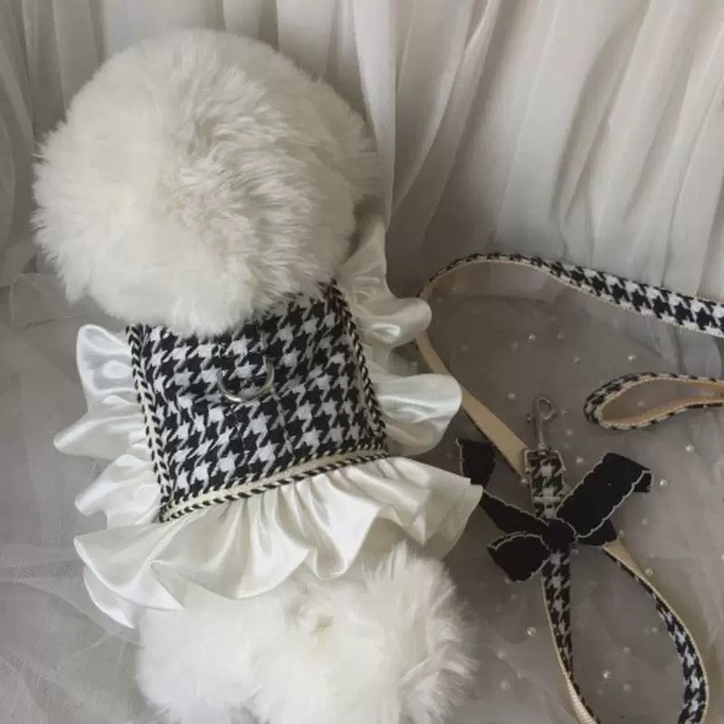 千鳥格子柄が上品なハーネス&リードセットです。フリルデザインが可愛らしさをプラスし、ワンちゃんをより一層華やかに演出します。