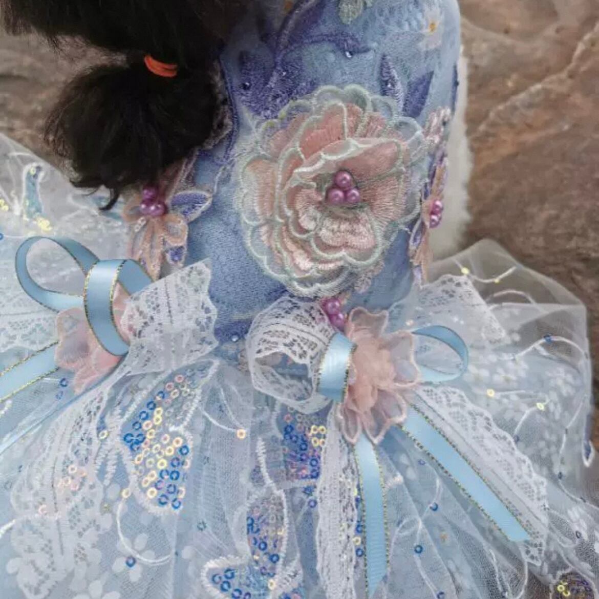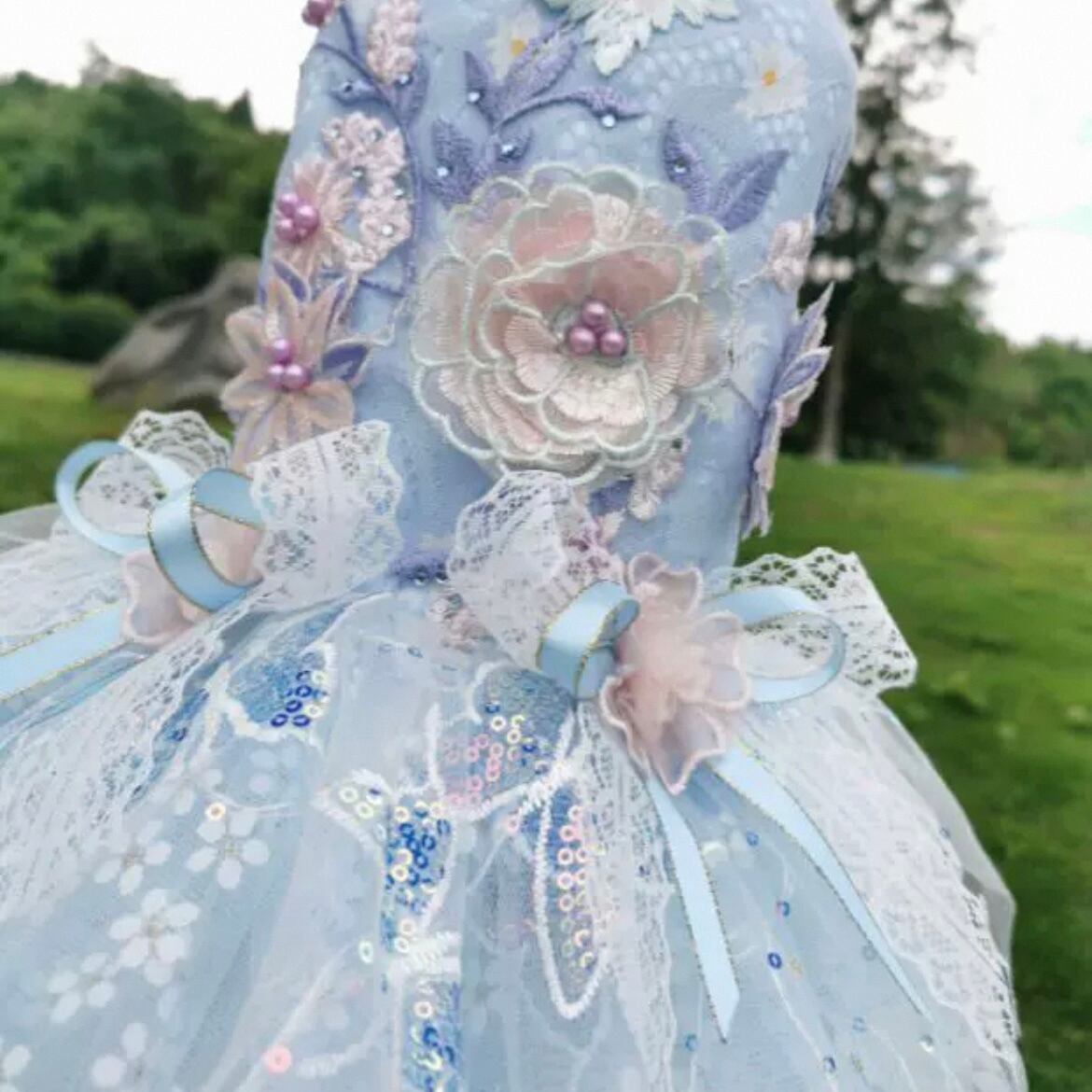 胸元から裾にかけて散りばめられた華やかな刺繍は、見る人をたちまち魅了します。