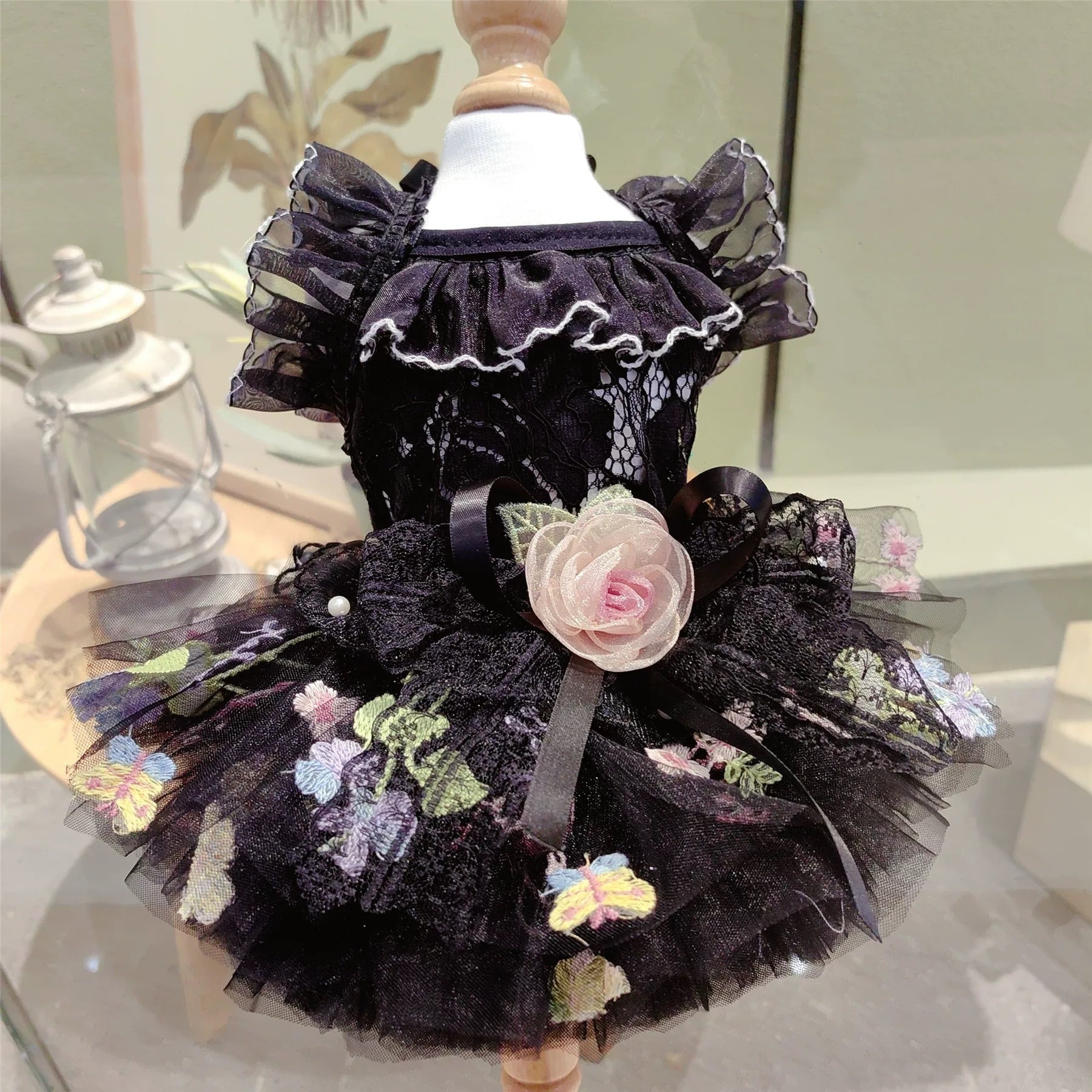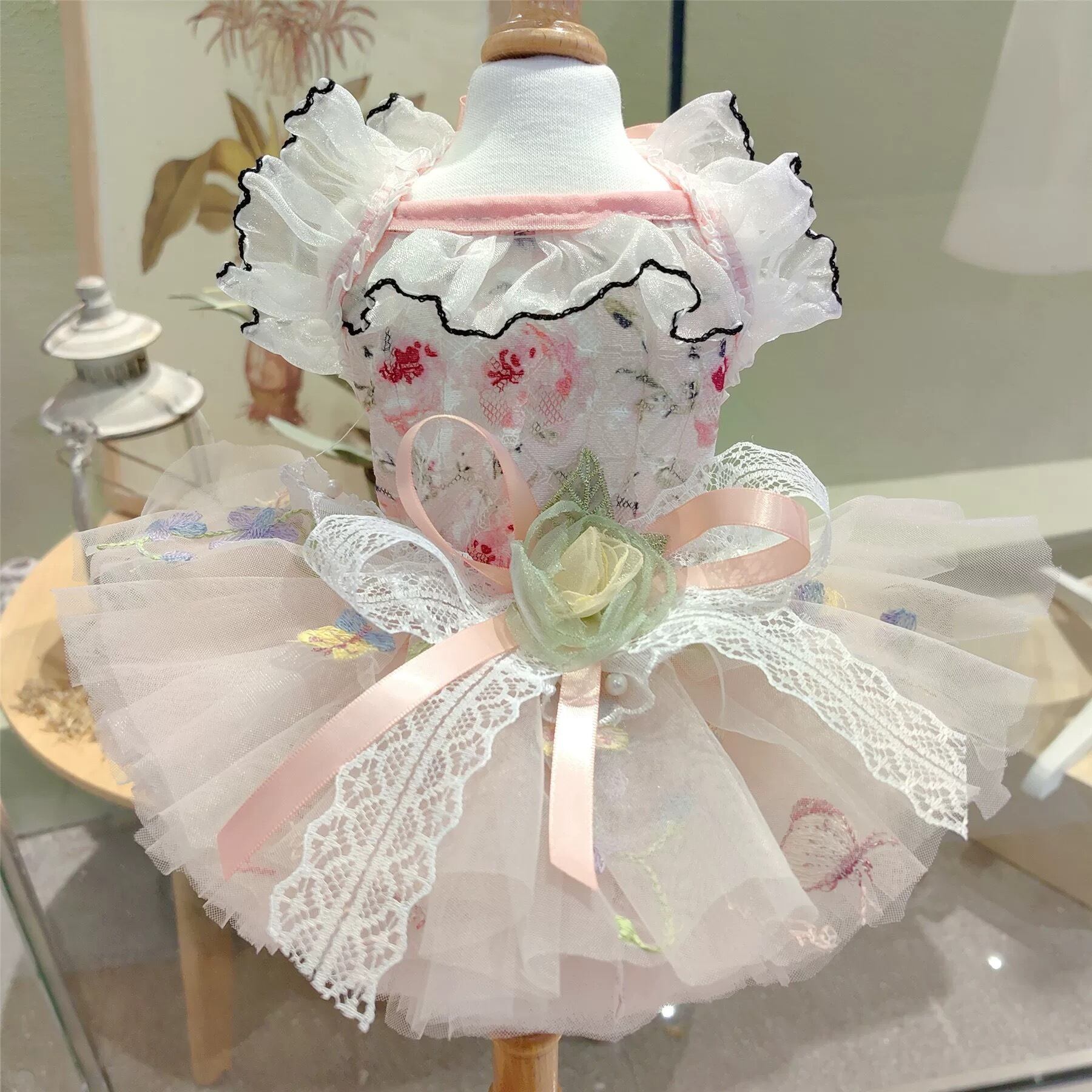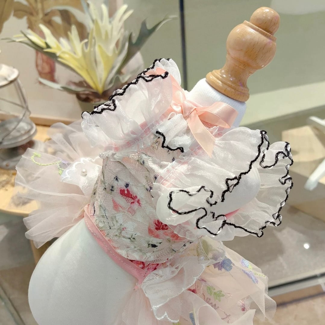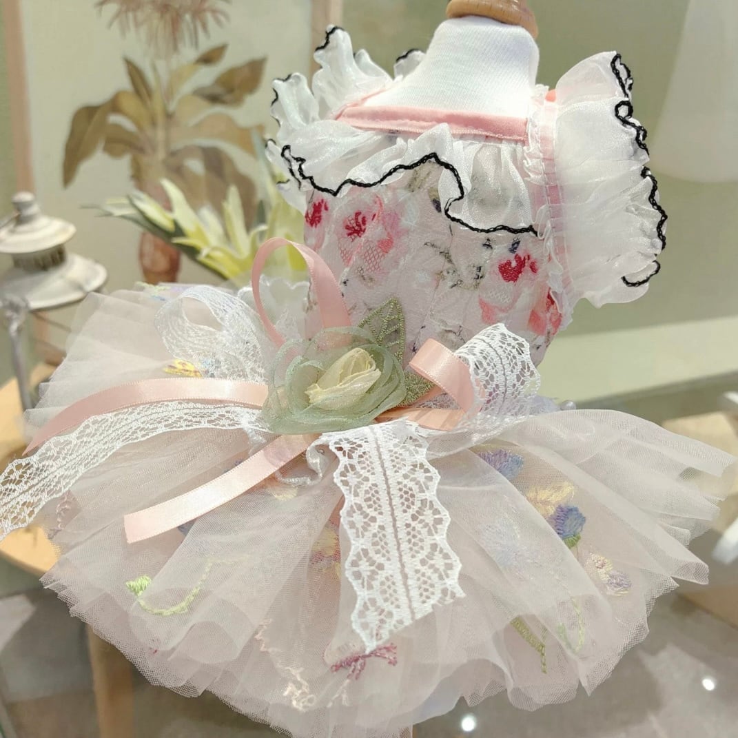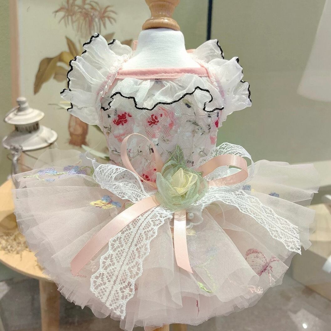 胸元のフリルと、スカートにあしらわれた刺繍されたちょうちょと小花が、愛らしさを引き立てます。